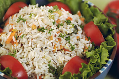 120g ryže, 6 dl zeleninového vývaru, 1 cibuľa, 2 zúbky cesnaku, 1 mrkva, 1 paprika, 1ČL oleja, hrášok, šampiňóny Na oleji osmažte cibuľu, mrkvu, papriku, cesnak, ryžu a zalejte vývarom. Keď začne vrieť, pridajte hrášok, šampiňóny a duste asi 15 minút. Vypnite a nechajte dôjsť asi 10 minút.